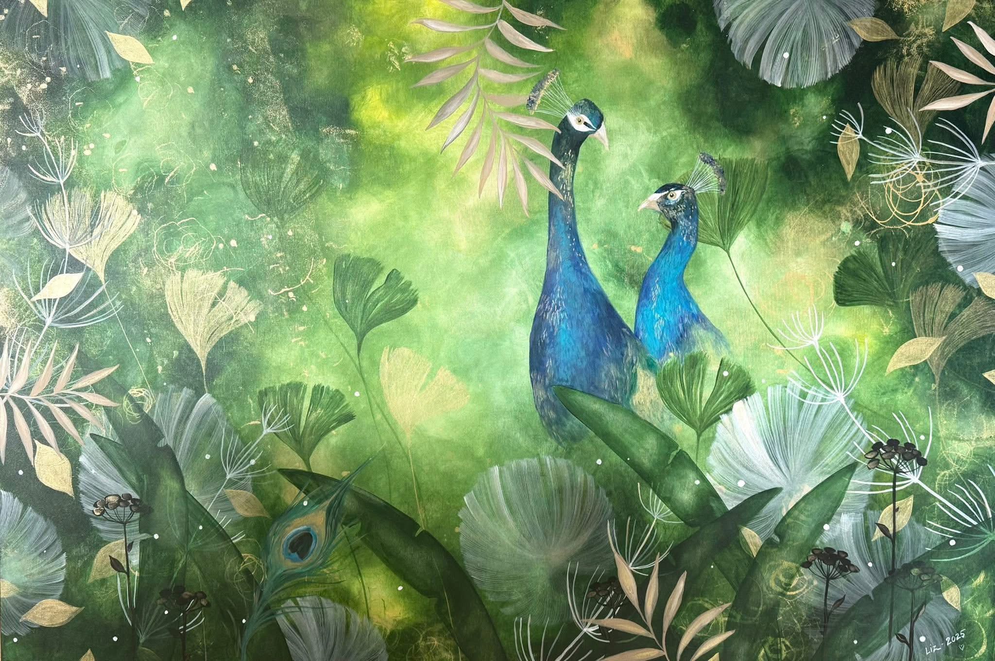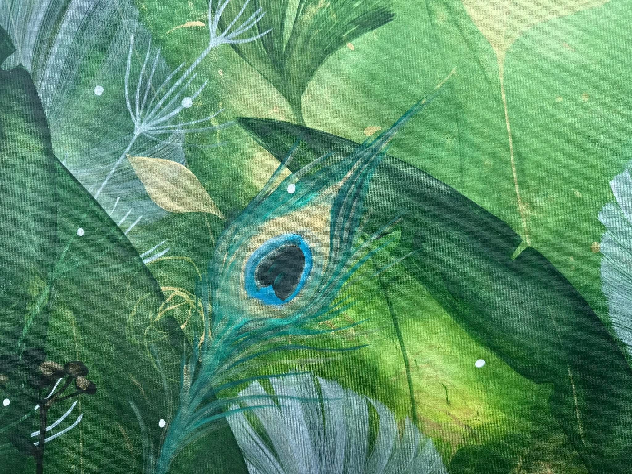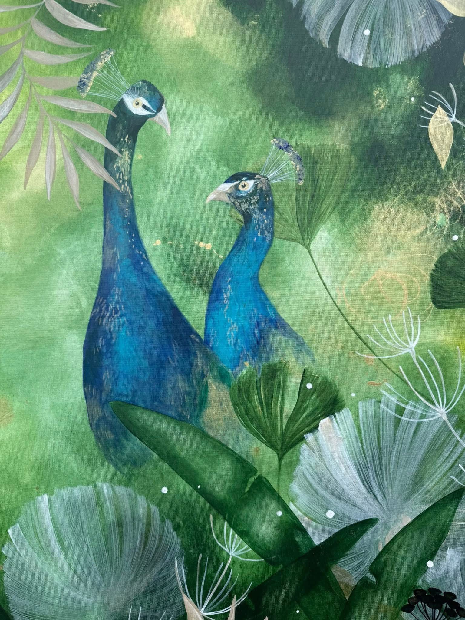 Lager efter lager växer målningen fram, grönska, blad och lekfulla former.